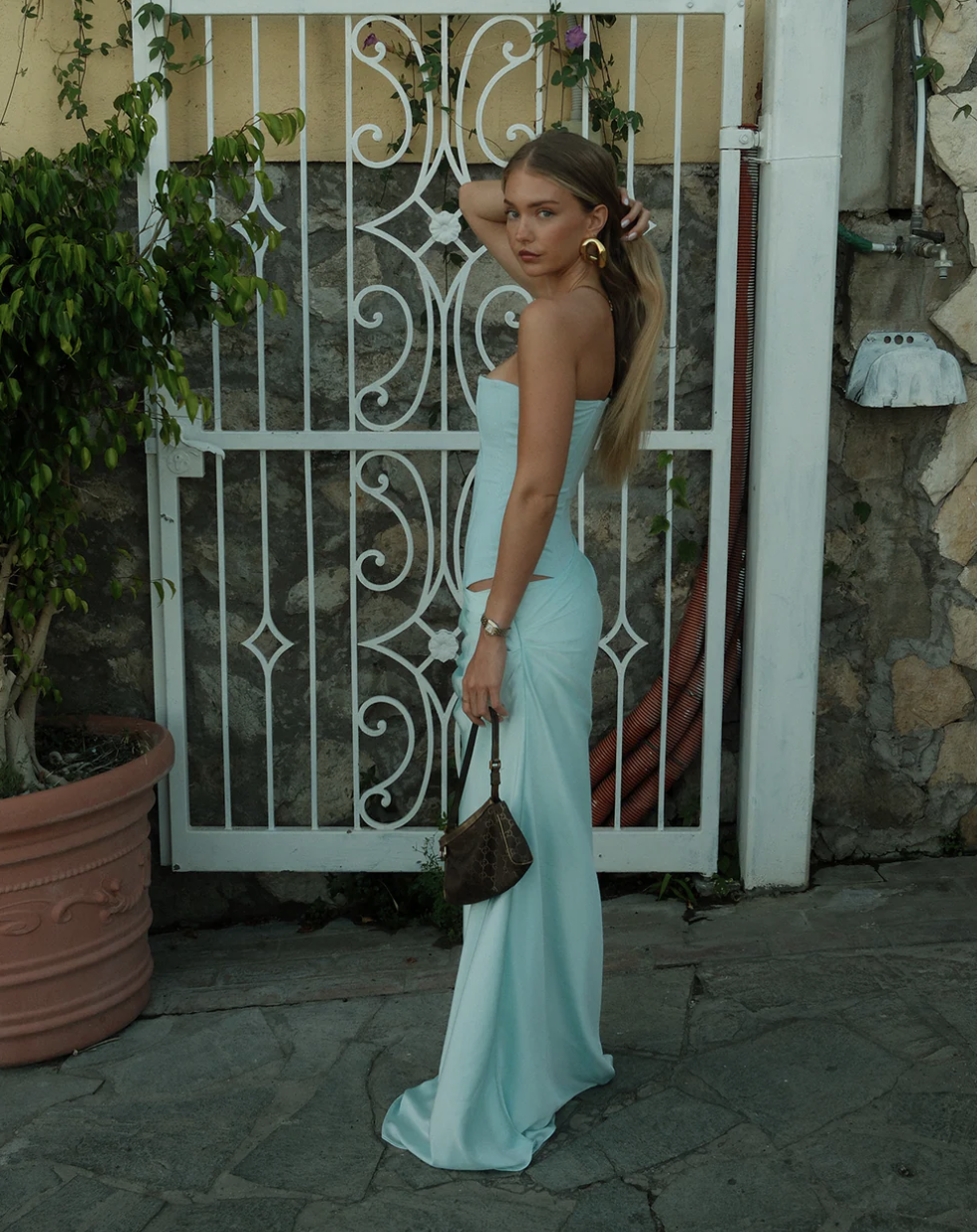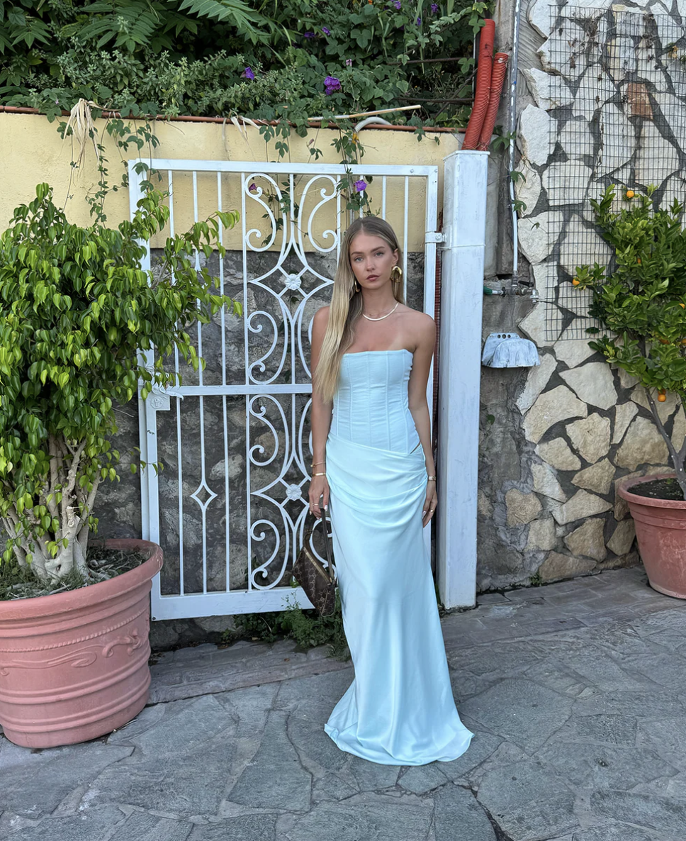 Huxley is an elegant yet modern gown that effortlessly blends on-trend design with timeless simplicity. Featuring a structured corset bodice with intricate boning, this dress beautifully contours the bust and waist for a flattering, sculpted fit.
