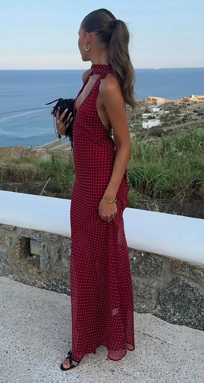 A statement maxi designed to turn heads. Crafted in a luxurious burgundy polka-dot georgette, this elegant silhouette features a deep plunging neckline with an adjustable (and detachable) neck tie for a custom fit. The low open back is finished with an adjustable tie, creating a striking yet refined look from every angle.